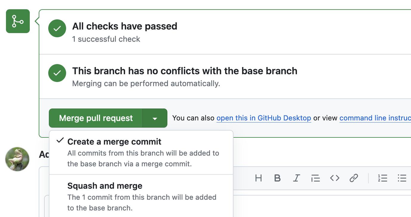 Once everything is validated, merge the pull request. If there are many minor commits, use "squash and merge" to merge them into one.