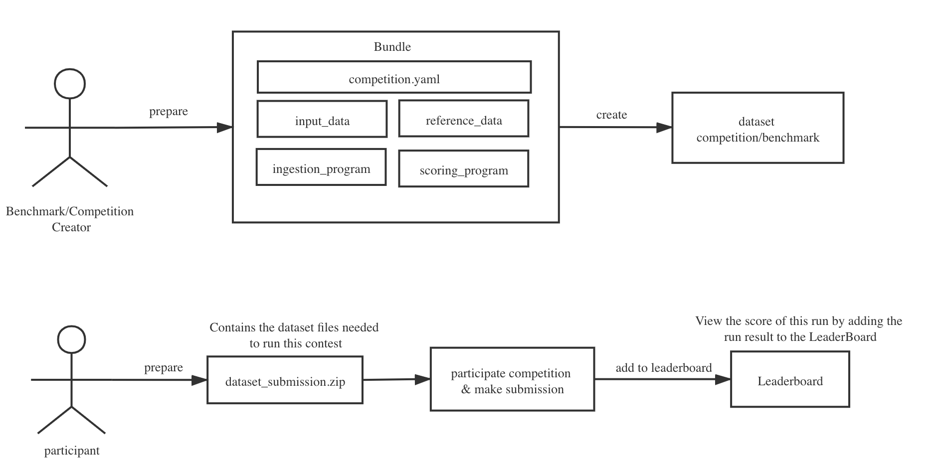 There are two main parts: - the contest organizer creates the dataset competition by uploading a bundle (For more information on how to create a contest via bundle, and the definition of bundle, you can refer to this link Competition-Creation:-Bundle)